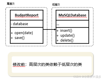 在本例中,高层次的预算报告类(BudgetReport)使用低层次的数据库类(MySQLDatabase)来读取和保存其数据。这意味着低层次类中的任何改变(例如当数据库服务器发布新版本时)都可能会影响到高层次的类,但高层次的类不应关注数据存储的细节。