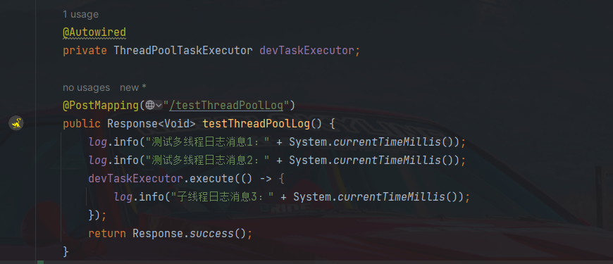 使用异步线程的场景,加入这个调用里面。再次执行看开效果,会发现显然子线程丢失了 traceId。所以需要针对子线程使用情形,做调整,将父线程的 traceId 传递下去给子线程即可。