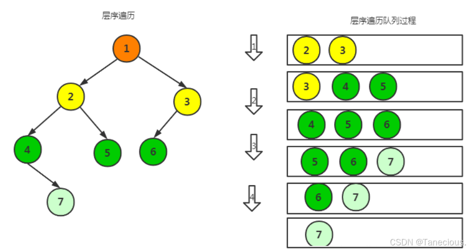 要想实现层序遍历是没有办法通过想前面实现前中后序遍历那样通过递归实现,这里借助队列这一数据结构实现层序遍历。