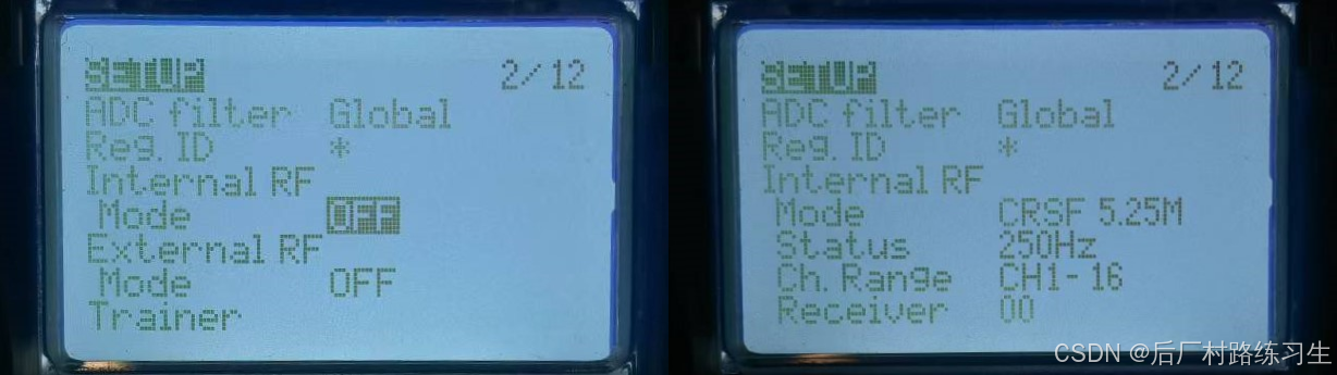 3、检查其当前状态是否为 OFF。如果是 OFF,请按下滚轮进入编辑模式;滚动滚轮选择 CRSF(即 ExpressLRS 所需的协议);按下滚轮确认设置。