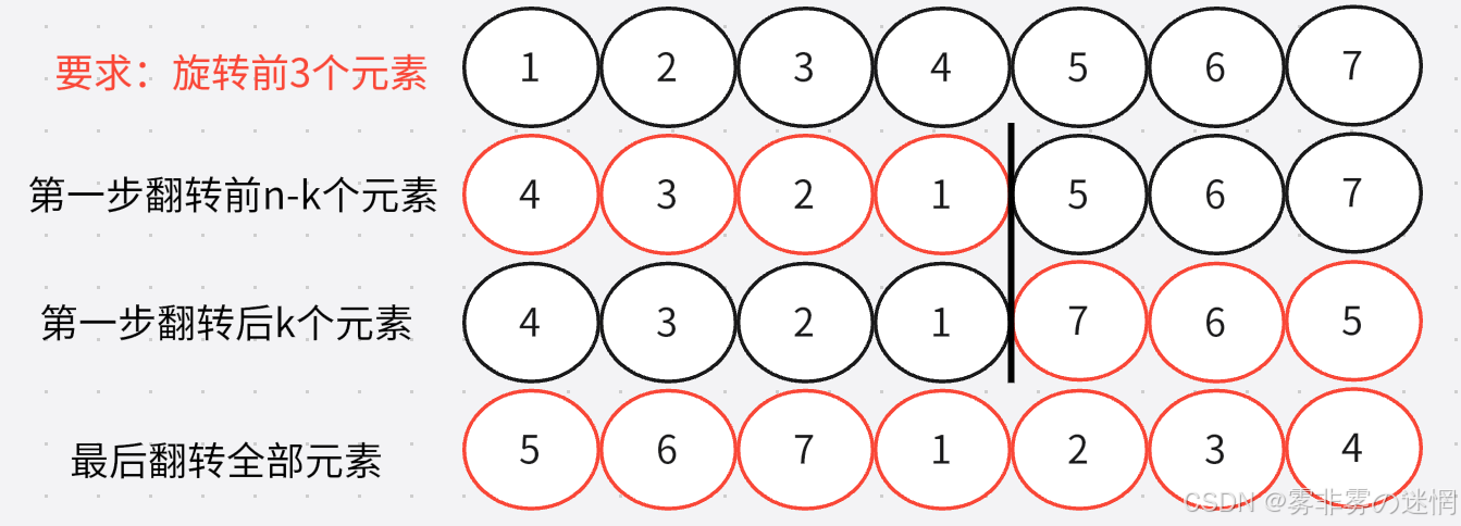 **(3)算法解法:**我们先将数组的前n-k个元素旋转交换位置,再将后k个元素旋转位置,再整体旋 转交换位置,拿时间换取空间。例如下面这样: