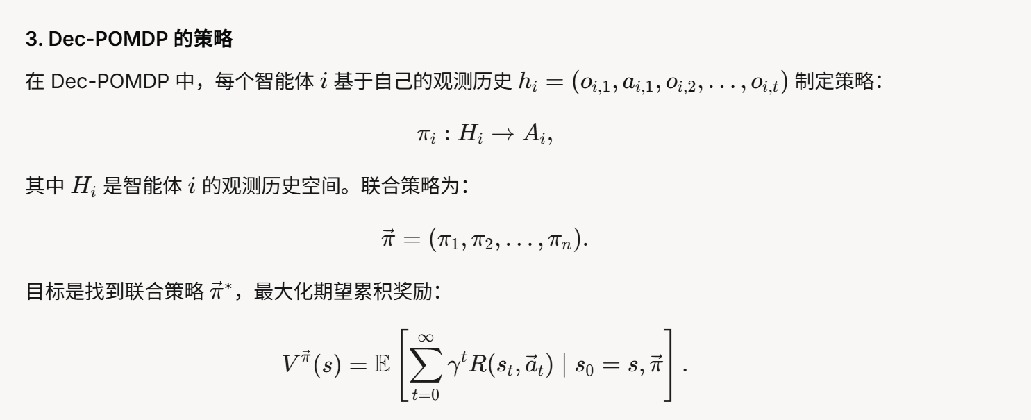 在多智能体场景中,例如多个机器人协作完成任务,每个智能体都有自己的观测和动作,无法直接知道其他智能体的状态或动作。这种情况被建模为 Dec-POMDP。Dec-POMDP 扩展了 POMDP,考虑多个智能体在去中心化(无中央控制器)的情况下如何协作或竞争。