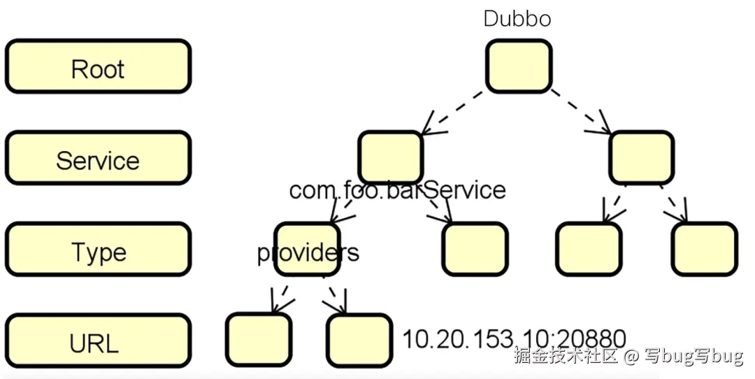 我们进一步分析这些注册信息,可以看到,Dubbo 对各个节点进行了合理编排,构成了 Root、Service、Type、URL 这样的服务地址分层结构。