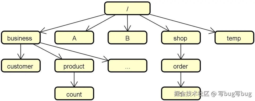 如上图,节点 count 位于/business/product/count 路径,节点 temp 可能存储着数据 100,而节点/shop/order/1 可能存储着类似{"id":"1","itemName":"Notebook","price":"4000"}"这样的复杂数据结构和信息。ZooKeeper 中所有数据都是通过 ZNode 的路径被引用的。