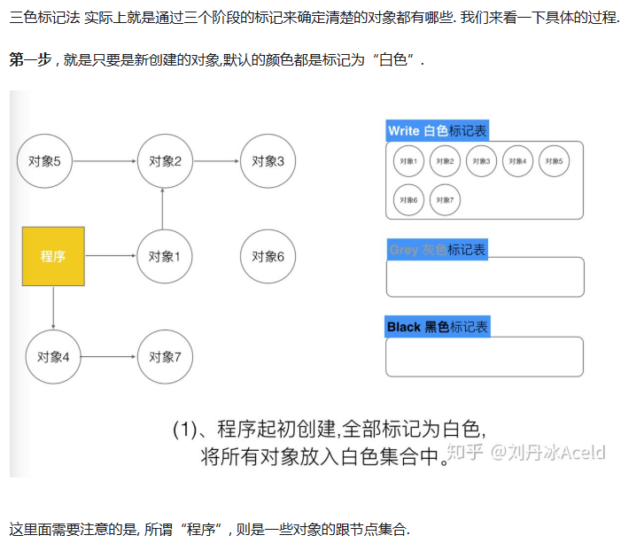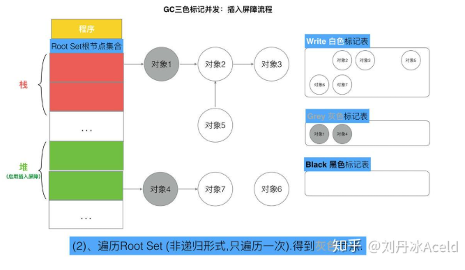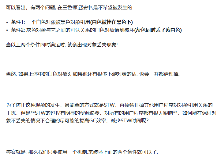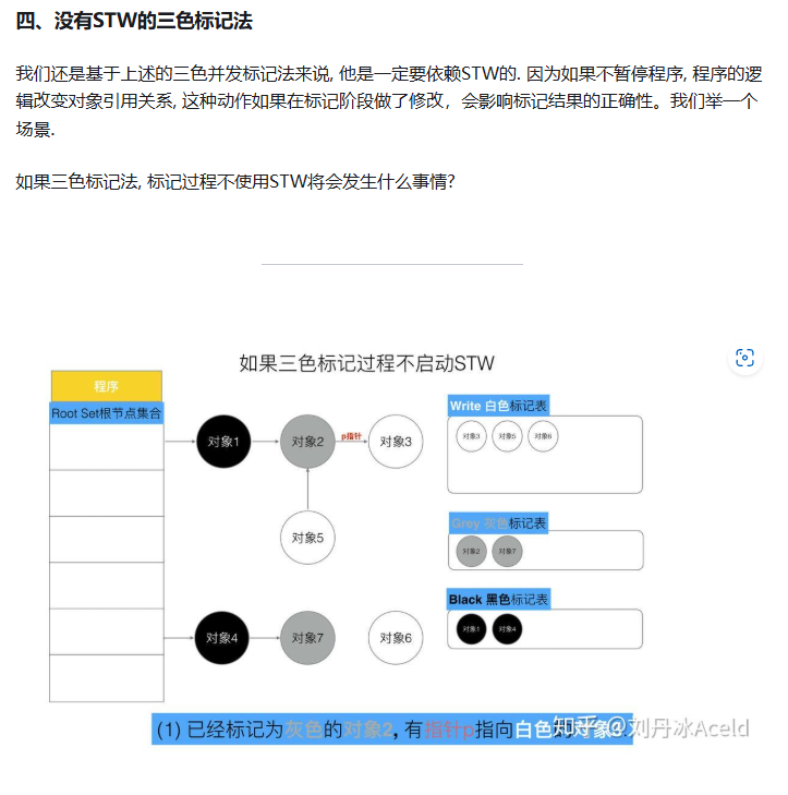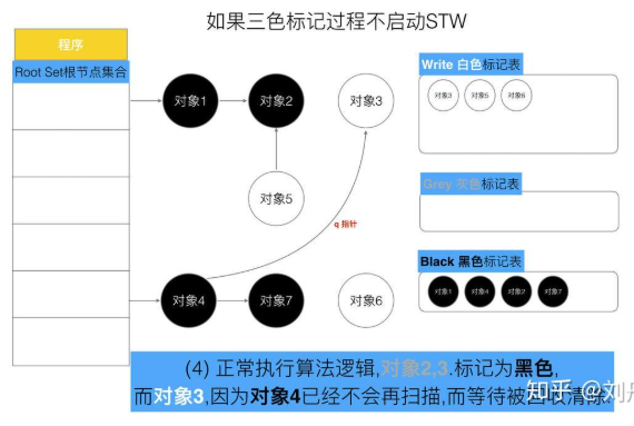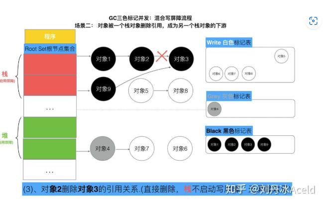 但是如果栈不添加,当全部三色标记扫描之后,栈上有可能依然存在白色对象被引用的情况(如上图的对象9). 所以要对栈重新进行三色标记扫描, 但这次为了对象不丢失, 要对本次标记扫描启动STW暂停. 直到栈空间的三色标记结束。