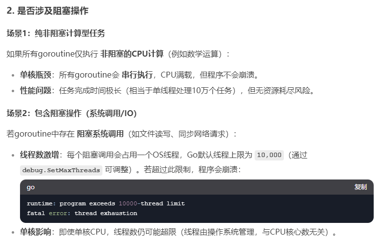 上限限制:Go默认允许最多10,000个线程(通过runtime/debug.SetMaxThreads设置),因此1000个线程不会触发崩溃,但需注意资源消耗。