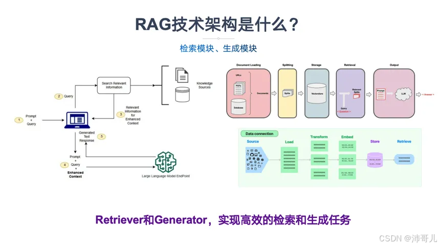 RAG架构的工作原理是从外部来源检索数据,将其处理到大语言模型的语境中,然后基于组合来源生成回答。该过程包括三个主要阶段:数据准备、检索和生成。