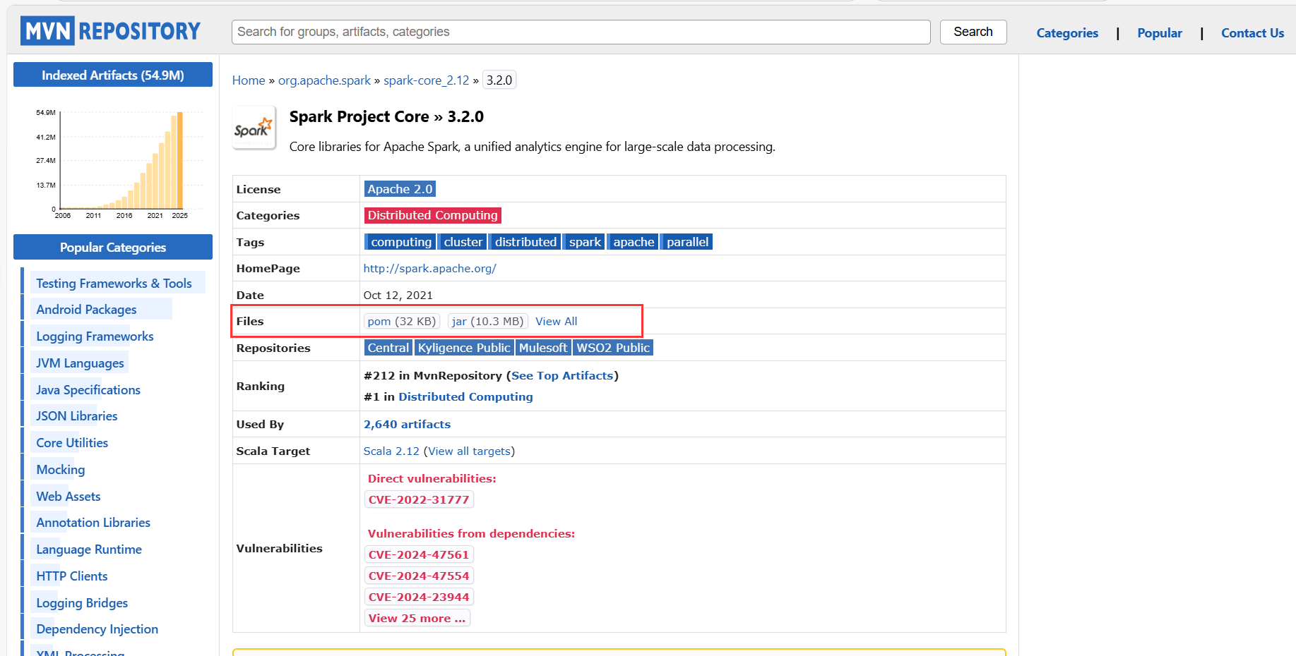 我们可以在maven的仓库中找到对应版本的源码信息:https://mvnrepository.com/,在这里以spark-core_2.12-3.2.0为例,我们搜索spark-core之后找到对应的版本。