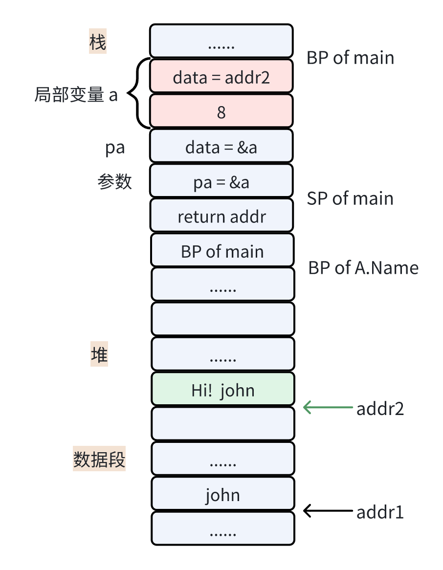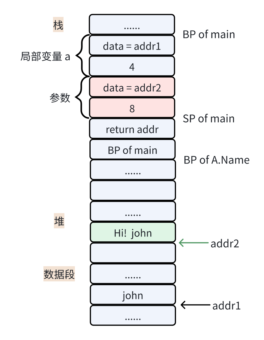 当函数执行到 Name 函数中 pa.name = "Hi! " + pa.name 这行代码时,就需要修改 &a 这个地址处的变量即局部变量 a,它被修改为指向新的字符串内容且字节数目修改为 8。