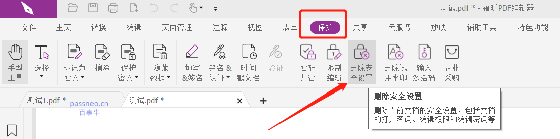 2、点击菜单选项卡【保护】-【删除安全设置】,弹出对话框后,输入原本设置的密码,再点击【确定】,即可解除限制。