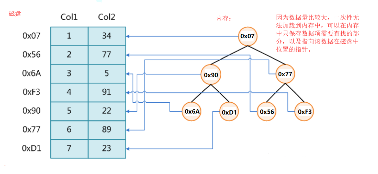 可以考虑将 存放关键字及其映射的数据的地址放到一个内存中的搜索树的节点中。需要访问数据时,先取这个地址去磁盘访问数据。