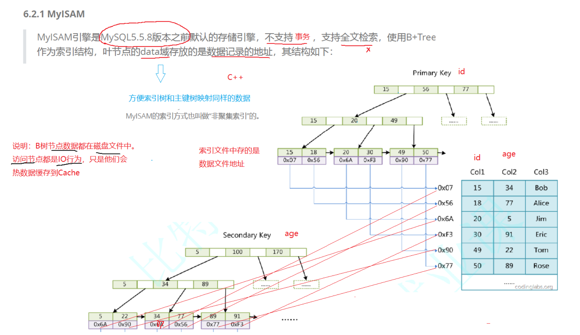 MyISAM 的索引文件仅仅保存数据记录的 地址 。 在 MyISAM 中,主索引和辅助索引( Secondary key )在结构上没有任何区别,只是主索 引要求 key 是唯一的,而辅助索引的 key 可以重复。