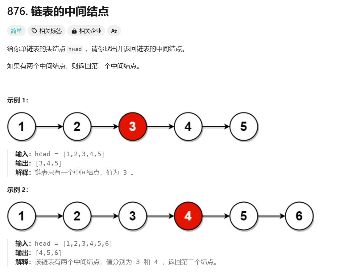 思路:首先我们可以计算处链表的长度,其次只要将链表的长度/2 之后再遍历我们就可以得到第二个中间节点的值了