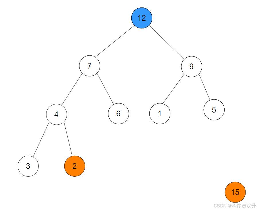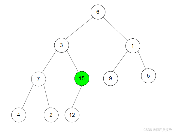 15,因此这棵子树本身就是一个大顶堆,我们继续向前遍历。 -