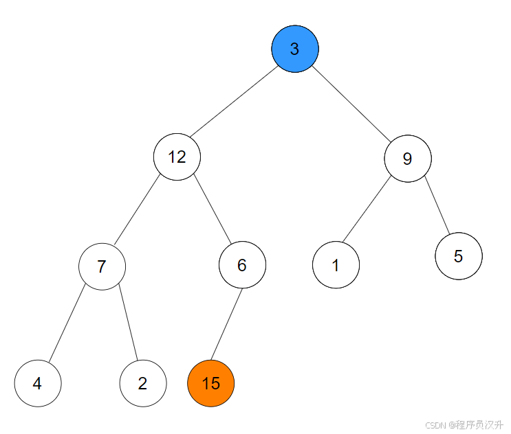 直接孩子了,但是,由于3和15的交换,导致了该子树的右子树不再是一个大顶堆。现在,3是该子树的右子树的根节点,而这个根节点的右孩子是12,12大于3,它已经不符合大顶堆的概念了。这时,重要的知识点来了:由于大顶堆构建导致的一次节点值互换,有极大的可能直接导致以参与值交换的孩子节点为根节点的子树不再是一个大顶堆 ,简而言之,大顶堆的构建过程中的值互换操作,会导致一个更小的子树不再是大顶堆,放到这里就是,节点值为3的子树,为了变成大顶堆,和它的右孩子节点,也就是值为15的节点发生了交换,这时这颗子树的根节点值不再是3了,而是15,如上图所示,而这时,这个子树的右子树的根节点不再是15了,而变成了3,这就直接导致这个右子树不再是堆 了,其有序性遭到了破坏。这时,我们要继续深入,攘外必先安内,解决掉这个问题。我们将当前的游标指向当前树的右子树根节点,也就是现在值为3的节点:
