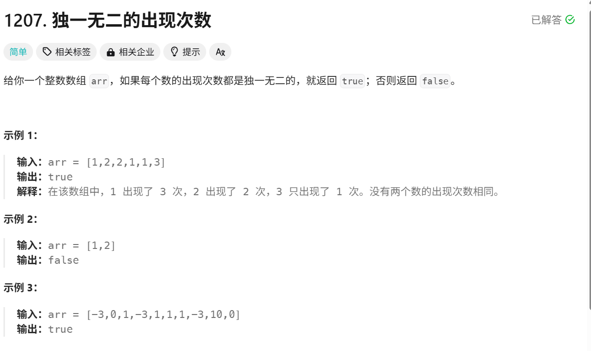 可以通过哈希集来判断是否独一无二,如果set中已经包含了count,那么set.add(count)会返回false