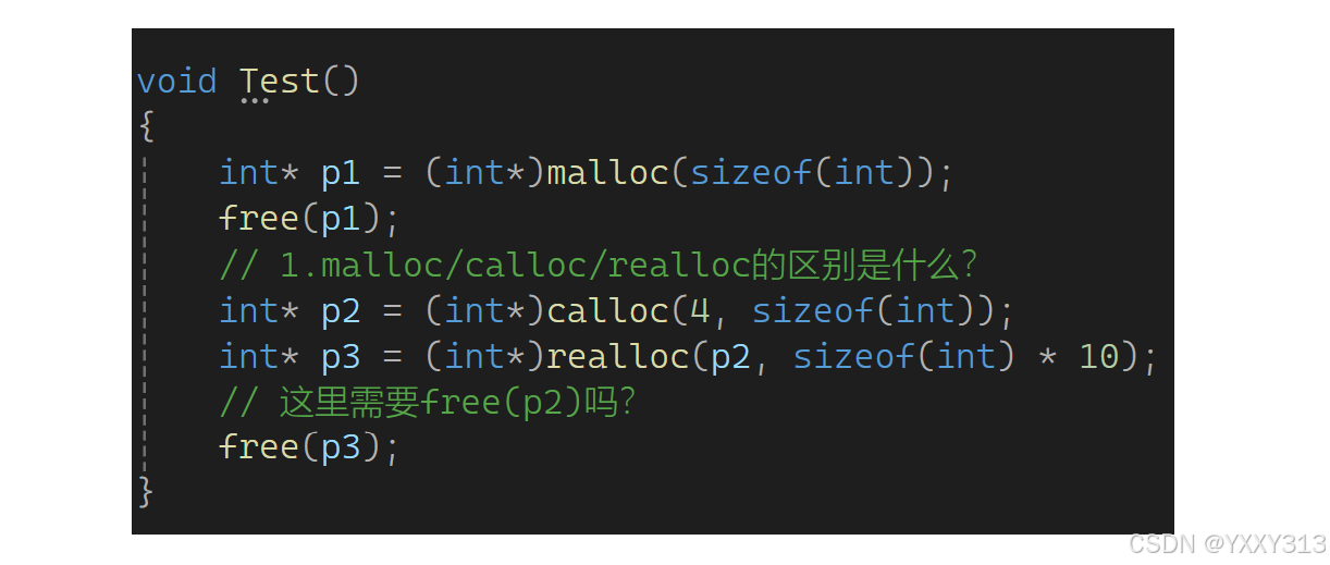 简单说malloc就是直接开相应的空间,calloc就是直接开的同时初始化,realloc会对已有的空间进行相关的扩容。那需要free p2吗?不需要,因为用realloc扩容时有这样的规定:1.原有的空间足够就原地扩容。2.原有的空间不足够就在新的位置开空间,把p2的内容拷贝过去再释放p2原来的空间,返回p3,安全起见把p2置为空就行。