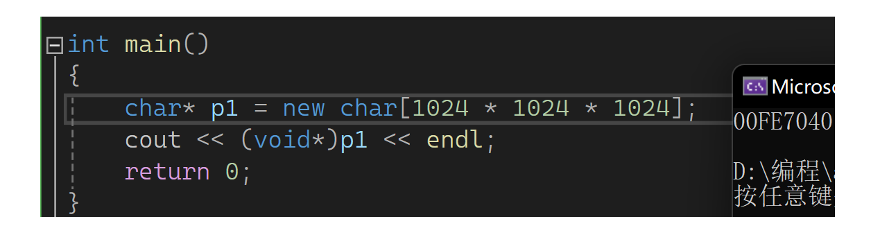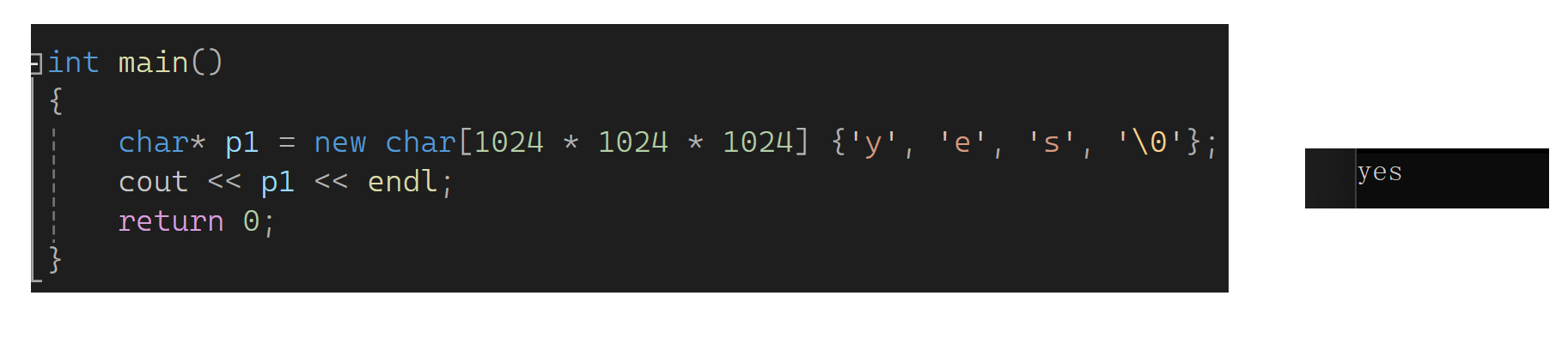 这里申请了1个G的内存,运行发现无限打印乱码,原因在于cout不能打印char*的指针。因为cout通过函数重载识别类型,int*会识别为指针,char*会被识别为字符串,字符串通过\0截止。这里申请内存没有初始化,此时就一直打印找\0。
