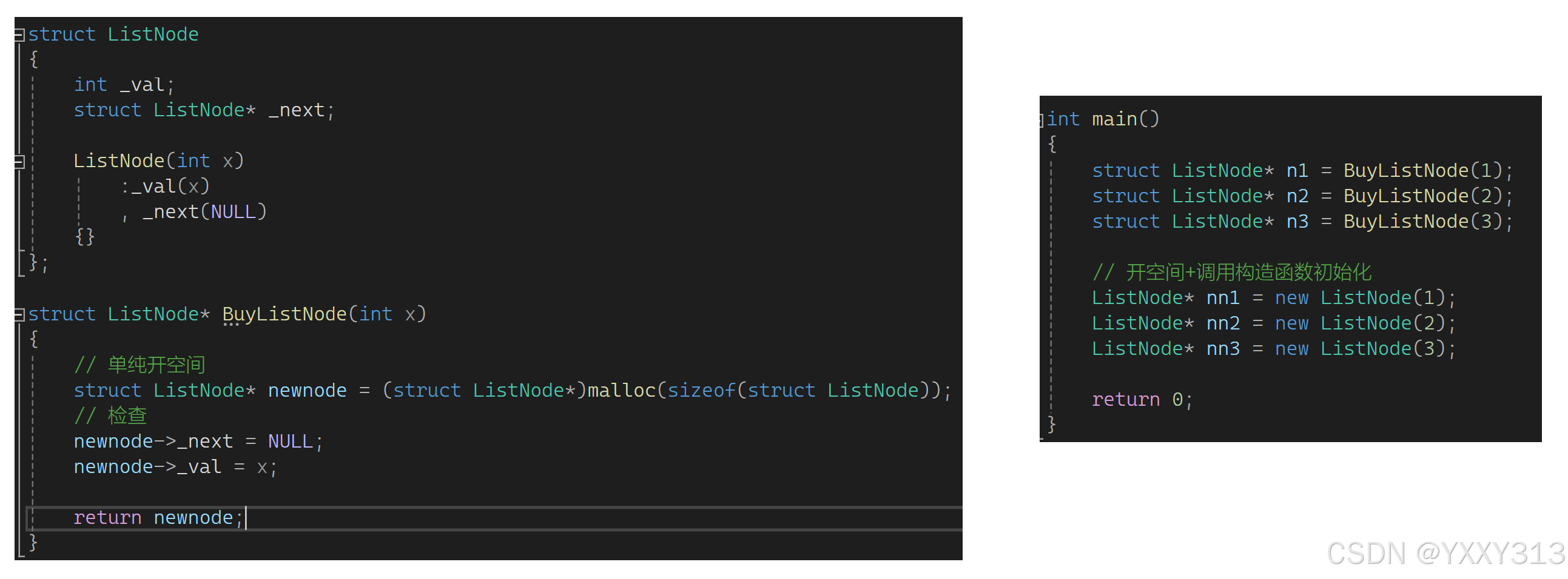 在单链表中C语言要个结点需要写一个BuyListNode函数,函数里面再malloc开空间。C++这里想的是能不能向构造函数那样定义出来就初始化了,所以C++new的时候还能顺便调一下构造函数。所以new和malloc对于内置类型除了用法上区别不大,真正的区别在自定义类型,malloc是纯粹的开空间,new除了开空间还可以通过调构造函数来初始化。因此祖师爷弄出来new并不是因为好用,而是要作很大价值,所以C++在这的核心价值之一是: