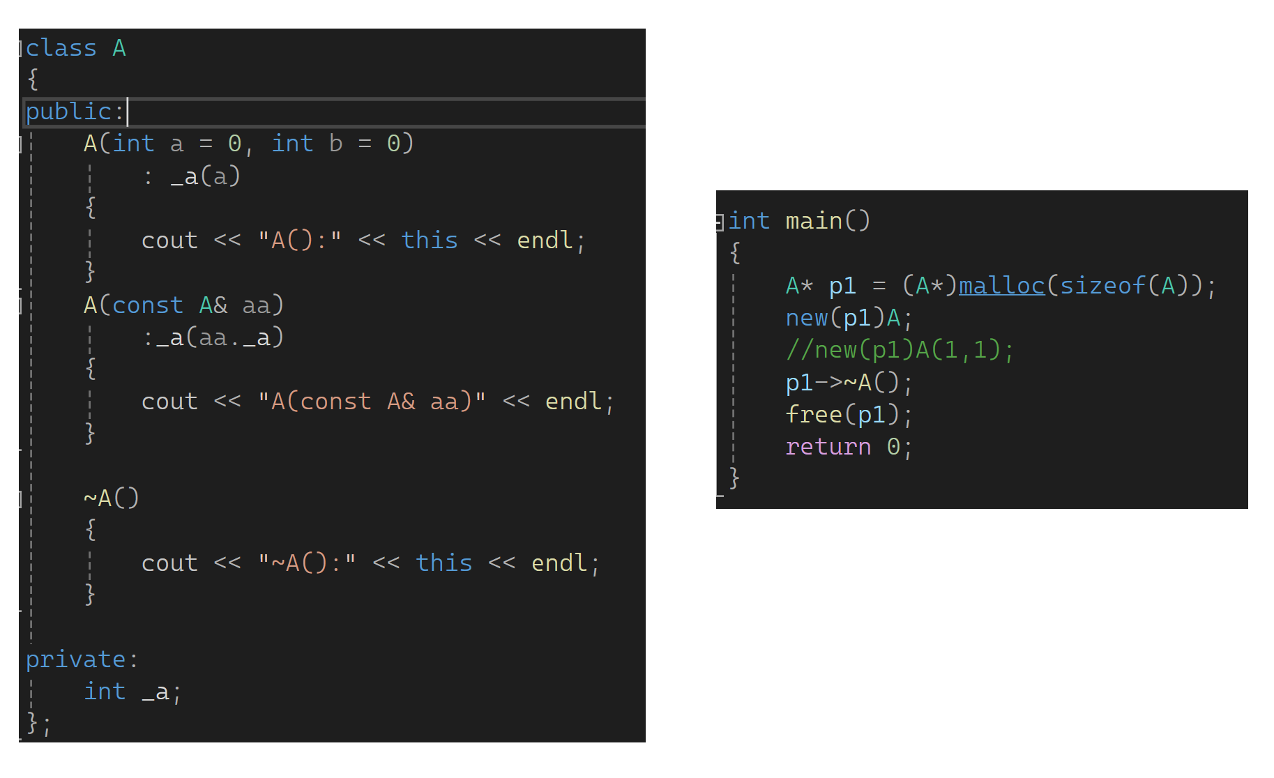 上图这有一块空间是malloc的,它没有调用构造函数,定位new可做的一件事情是显示调用构造函数。我们以前的构造函数都是自动调用的,比如实例化定义对象,new的时候自动调用。p1现在指向的只不过是与A对象相同大小的一段空间,还不能算是一个对象,因为构造函数没有执行。那想显示调用怎么办呢?