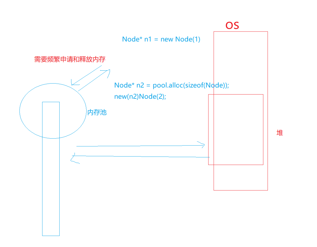 OS管理的内存上有块区域是堆,直接去找OS的堆要内存是一件相对麻烦的事情,可以理解为堆像小溪一样。现在有个应用要频繁申请和释放内存,那我每次从堆申请很麻烦。因此建立个池子,提前申请一大块内存放池子里面,要内存时可以不去堆而直接去池子要,池子中没有了继续从堆获取放池子里,这样就提高了效率,因为从池子取的距离比从堆取的距离近。内存池不是直接new和malloc的,可能提供了一个单独接口,从内存池申请的只有内存,是没有用构造函数初始化的:比如链表中以前开个结点就Node* n1 = new Node(1),为了节省效率找内存池可能就Node* n2 = pool.alloc(sizeof(Node)),但这块空间没有调用构造函数,此时就用定位new显示调用构造函数。