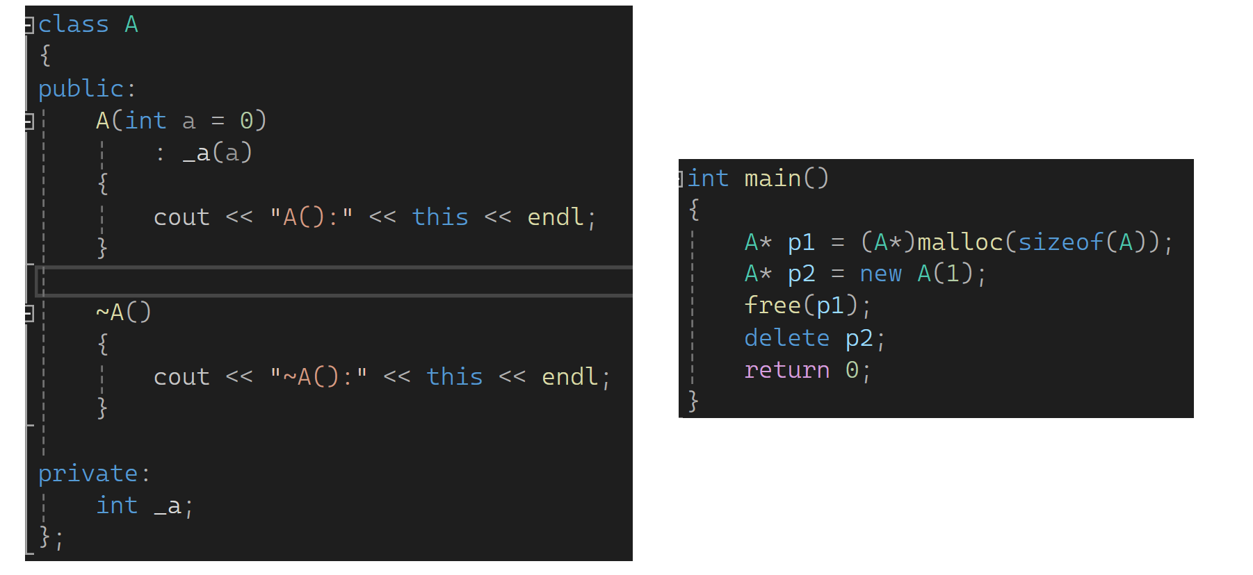 可以看到operator new就是调用operator new这个函数,new的话中间做了其他操作可以不管,但有两个我们想看到的核心操作就是调用了operator new和构造函数。再看delete,A::scalar不是直接调析构,可能某些原因封装了一层,里面看到先调用了析构再调用了operator delete。这就是new和delete的底层原理,也就是说祖师爷也想直接用malloc和free,奈何它们不是很符合我们需求,所以就用operator new和operator delete封装了。operator new和operator delete实际不是给我们用的,而是给new和delete用的。下面看个样例感受一下这样的顺序在什么地方非常有价值:
