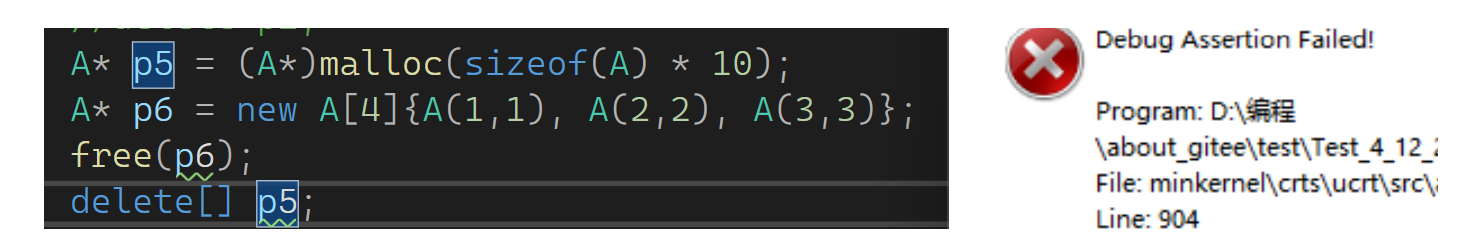 p1这除了开空间没有初始化,也没有调什么函数;p2这除了开空间还有初始化,且调用了构造函数。free就是单纯把p1指向的空间释放了;delete也把p2指向的空间释放了,但还调用了析构函数。基于这样的原因从此以后申请内存用new更好,它的优点有使用上更简洁,内置类型和自定义类型它都可以搞定。再来看一下下一个不同: