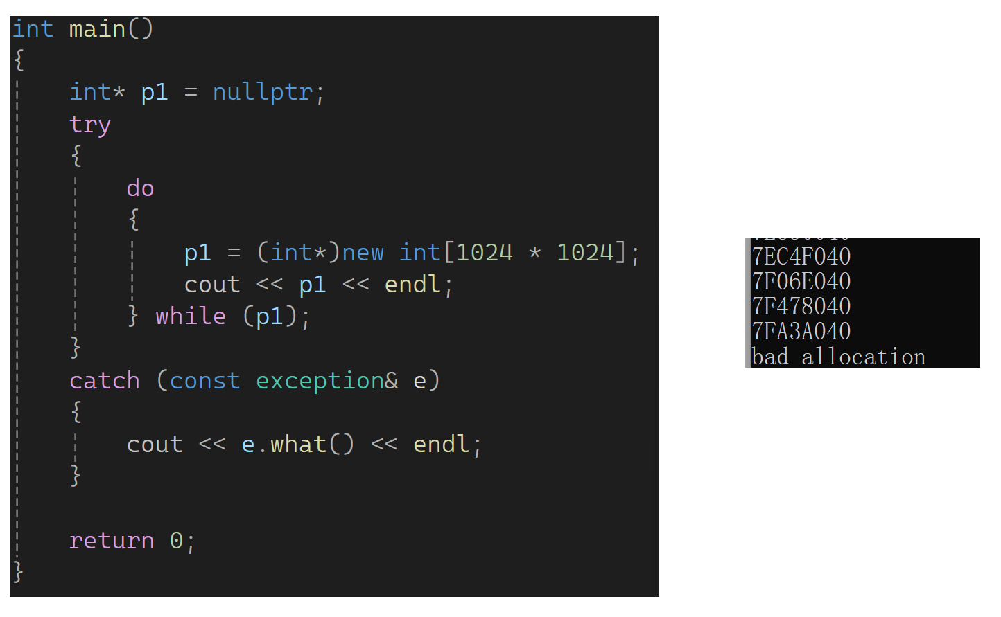 要用到try和catch(这里暂时了解一下就行),抛异常就失败的那次直接跳到catch里运行的地方e.what(),然后捕获异常就能拿到信息,这里看到出现bad allocation申请内存失败。理解了这块我们就明白:C++它期望出错了是用抛异常的方式处理错误,C语言是返回错误码。由于这样一系列原因,这时祖师爷在设计new的时候开空间就不能直接调用malloc了,因为C++要求申请空间失败了要抛异常,那这时怎么办呢?