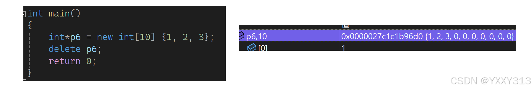 p5和p4的区别是p5是(),p4是[],p5是开一个int,10是在初始化,p4是开10个int的数组。那单个空间可以初始化,数组可以初始化吗?也是可以的: