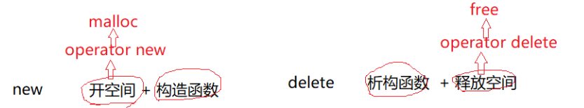 再来看看库里实现的,直接调malloc不行,但申请内存的那一下确实可以找malloc,它在这做的事是operator new就是对malloc的封装,如果失败后抛异常。可以这样理解,new在这申请内存调的是operator new,operator new是给new用的,operator new里面又去调用malloc,然后再调用构造函数。delete是先调用析构函数清理资源,然后调用operator delete,operator delete里面去调用free。