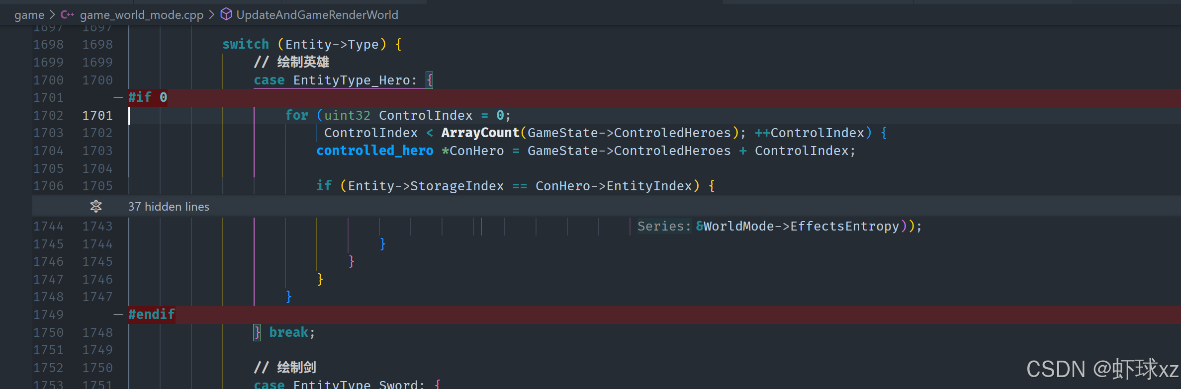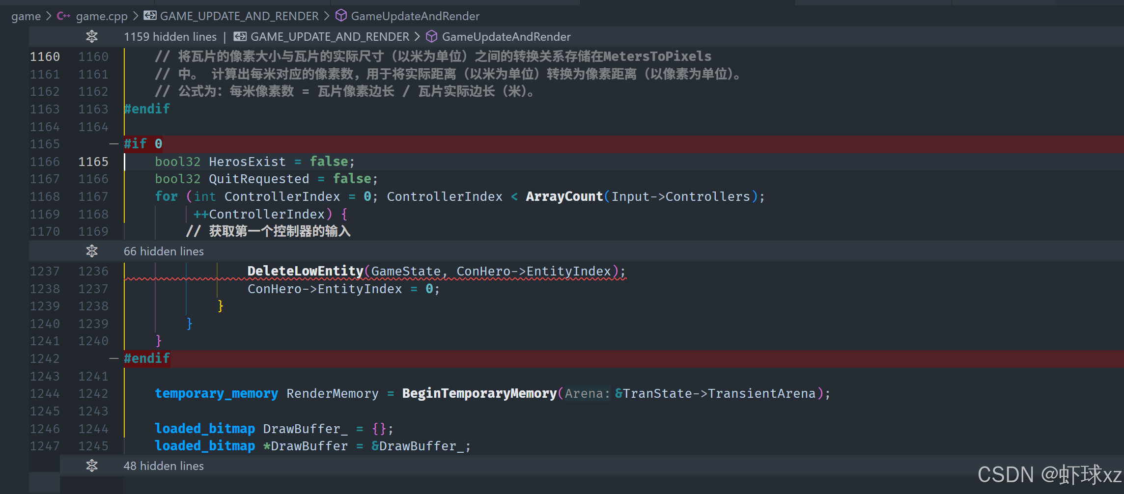 我们在主循环(位于 handmade.cpp)中,通过判断当前的游戏模式(Game Mode)来调用相应的更新与渲染逻辑,例如调用 UpdateAndRenderCutscene 或 UpdateAndRenderTitleScreen。但在这种结构中,一旦模式发生改变,比如玩家按下开始键,导致从"标题画面"或"过场动画"进入游戏世界模式,原来的逻辑不会立即跳出,而是会继续执行剩余部分,可能导致逻辑混乱或画面撕裂。