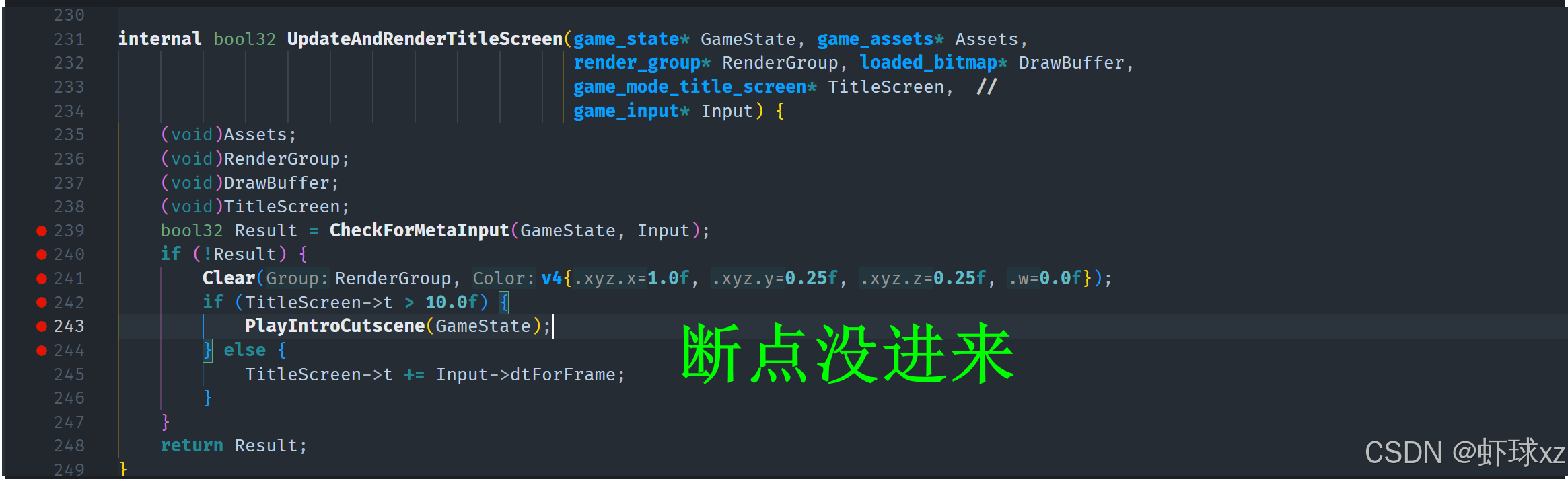 随后我们检查 PlayIntroCutscene 依赖的所有内容,确保都被正确包含和传递。同时注意到另一个问题:UpdateAndRenderTitleScreen 函数必须返回一个值。编译器提示我们遗漏了 return 的部分,这一块我们已经做了修正,确保它能返回正确的状态。