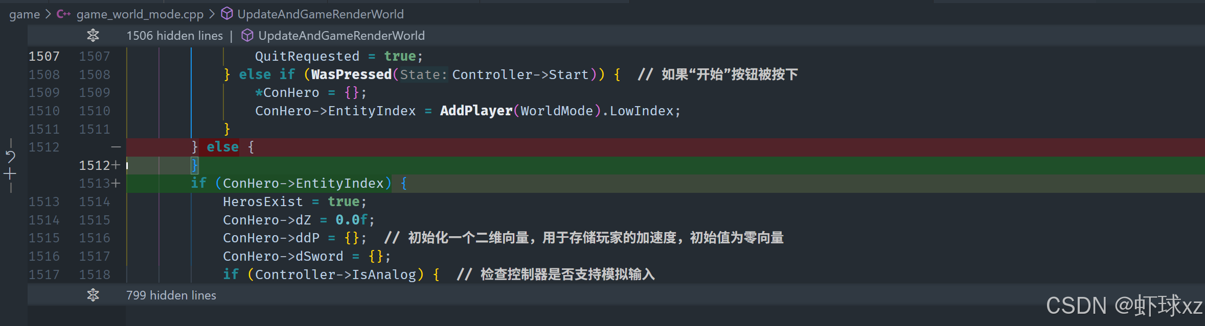 为了实现切换到游戏世界,我们使用了一个叫 PlayWorld 的函数,它会启动游戏世界并初始化玩家数据。当玩家按下"开始"键后,我们调用 PlayWorld,并将当前游戏状态传进去用于初始化。之后,如果需要进一步控制,比如直接渲染第一帧游戏画面,也可以调用 UpdateAndRenderWorld。