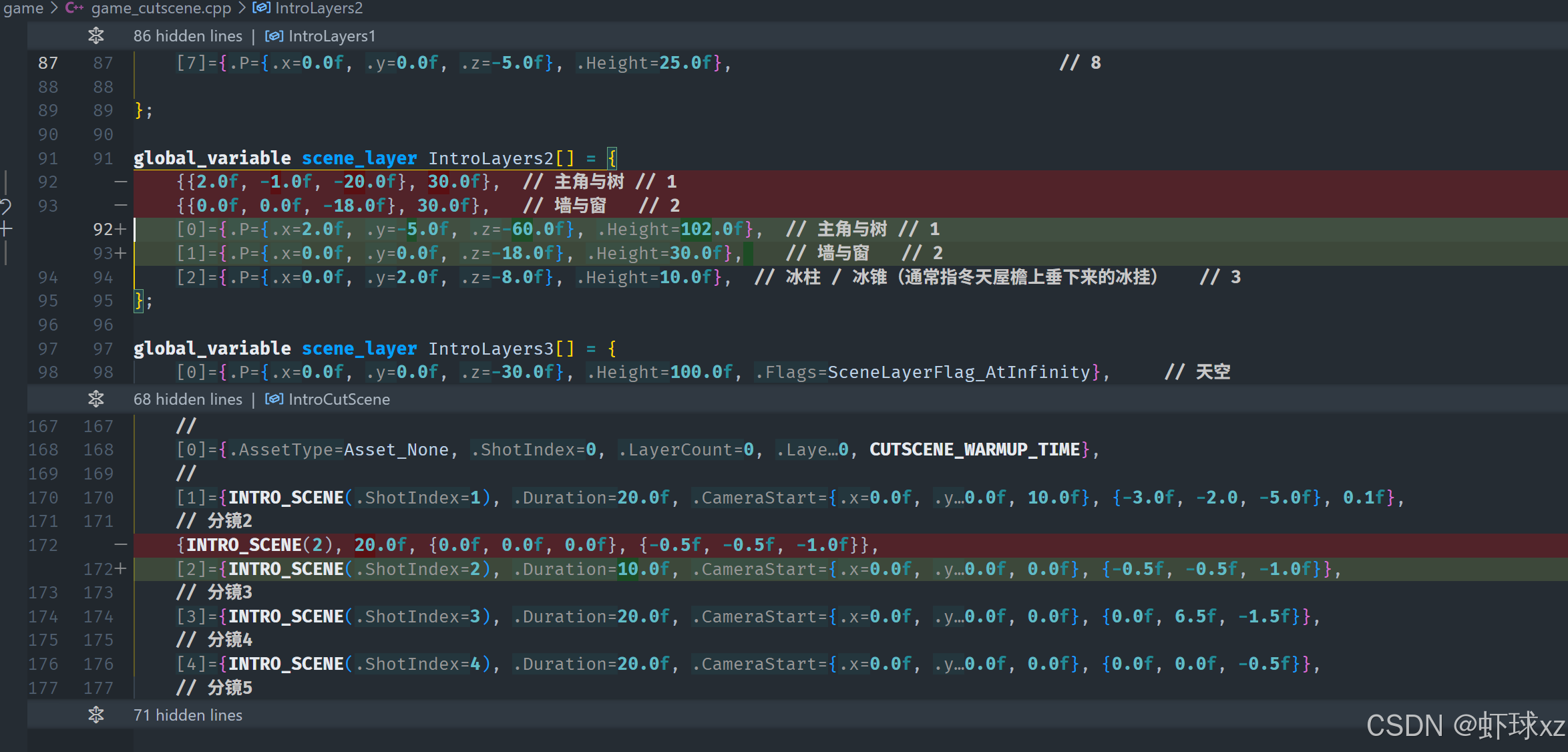 我们发现当前某一个镜头完全没有进行预期的缩放操作。昨天其实已经注意到了这个问题,当时还在想是否不小心把这个镜头的缩放逻辑删除了。查看代码后发现,这个镜头(比如镜头2)是有设置缩放的:从 (0,0,0) 缩放到 (5, -5, -1),按理说应该是有动态变化的。