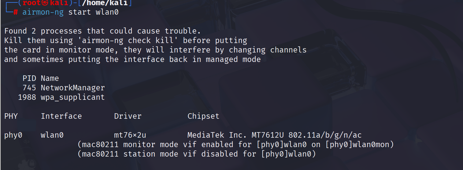 在打开成功以后你的wlan0通常会改名成wlan0mon,如果没有改名也不是遇到问题了,可以接着往下做。