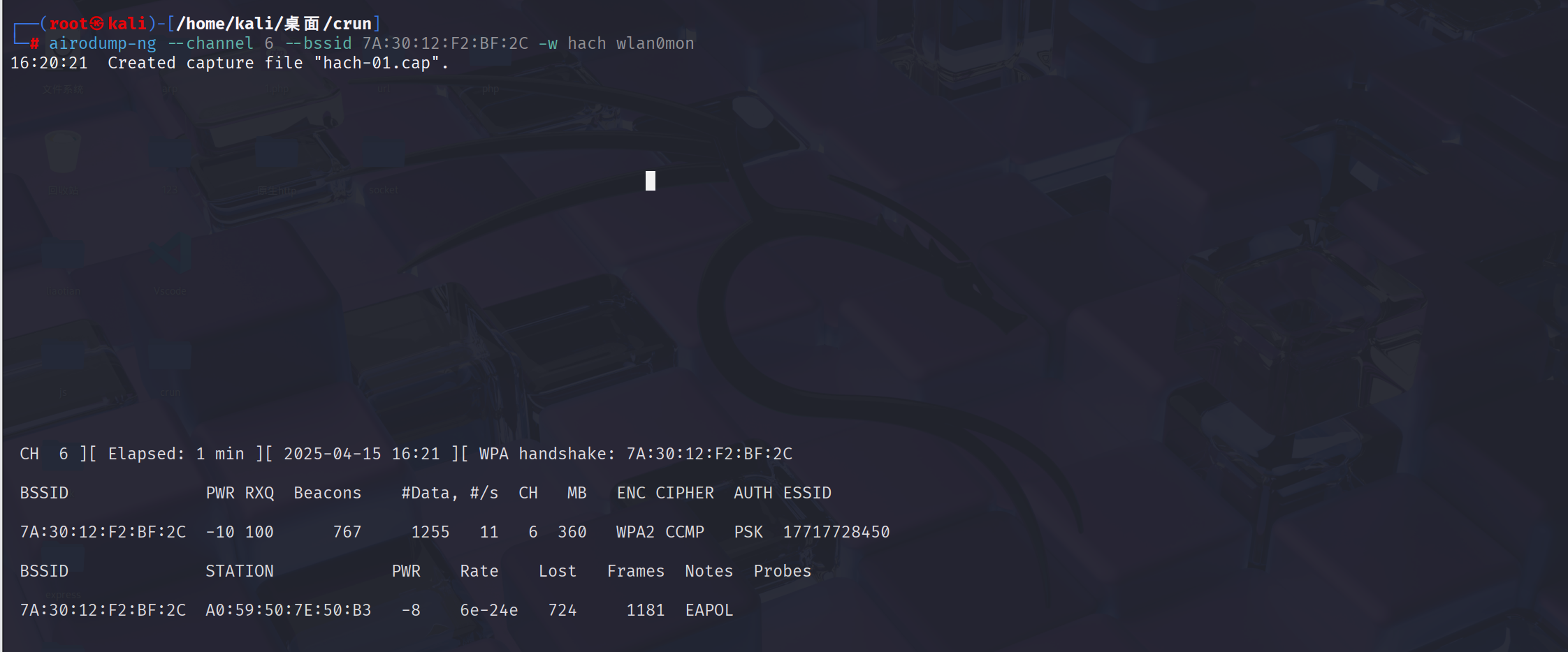 在扫描抓包的过程中-c或者--channel是信道对应上面扫描到的CH选项。--bssid是上面扫到的BSSID选项,-w代表写入的文件。最后填上网卡就行,这样你的设备会等待抓其它的设备的连接包。如果半天没有的话,我们可以扫描一下连接这个网络的设备,手动地踢一个设备让它重新连接。