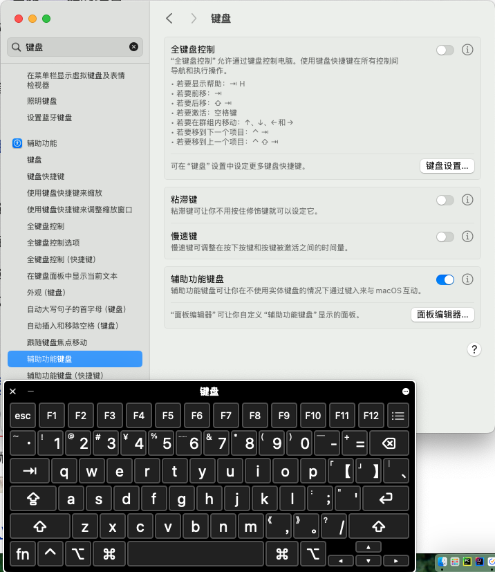 如果你不知道键盘按键都对应了系统里面什么键,可以在设置里搜辅助功能键盘,把这一项的开关打开(图里蓝色那个)。这样屏幕上会显示一个虚拟键盘(黑色那个),按什么键位会在这个键盘上同样体现出来。就容易确定按键是什么了。