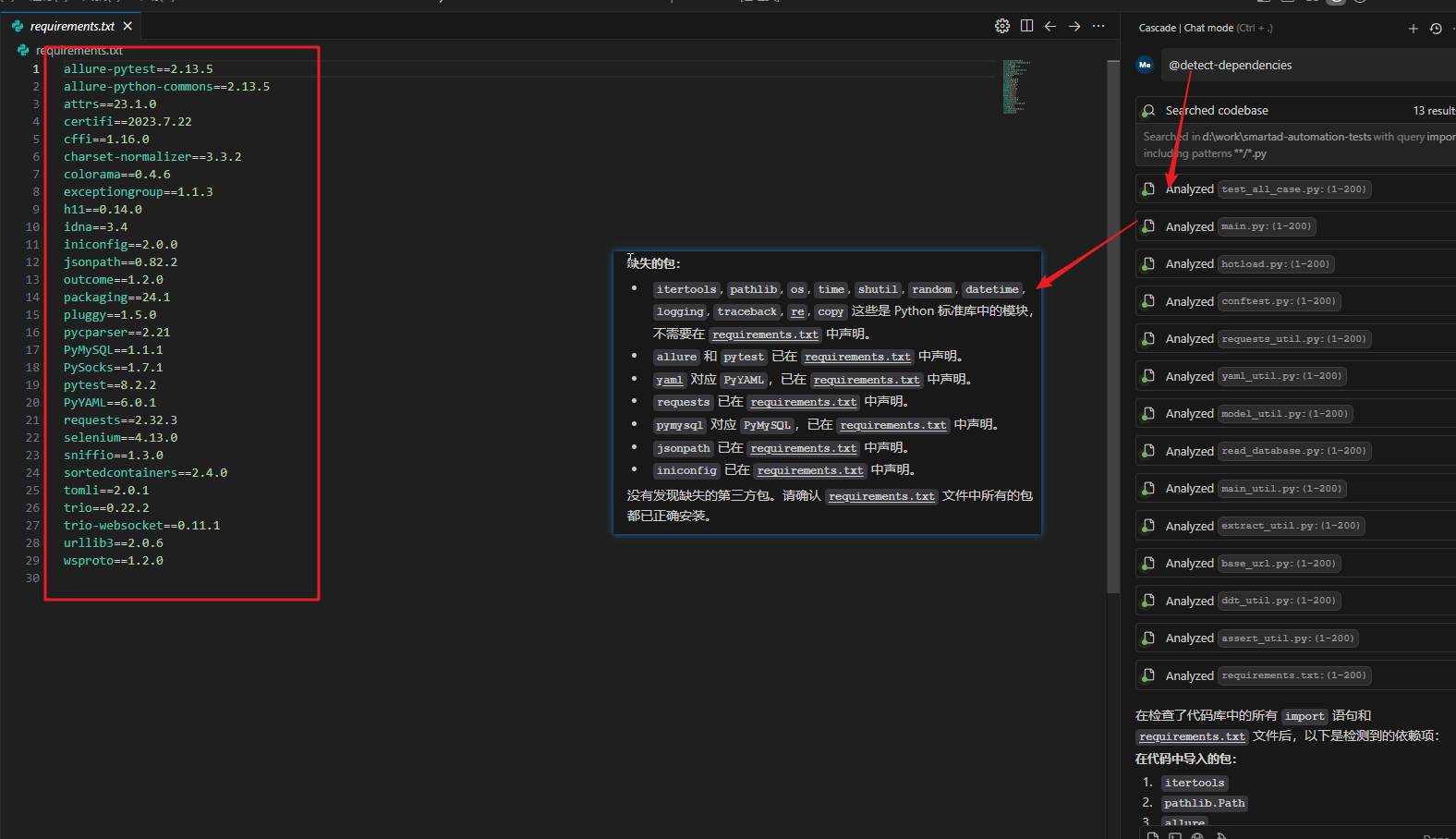 3. 在Cascade对话窗口输入@detect-dependencies查询