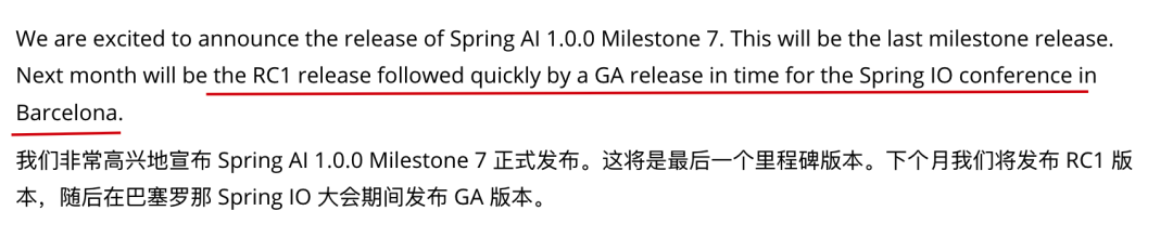 **Spring AI 发布了它的 1.0.0 版本的第七个里程碑(M7),**下个月就是 RC1,紧接着就是 GA!,对于我们 Java 开发者来说,这绝对是个值得关注的好消息!