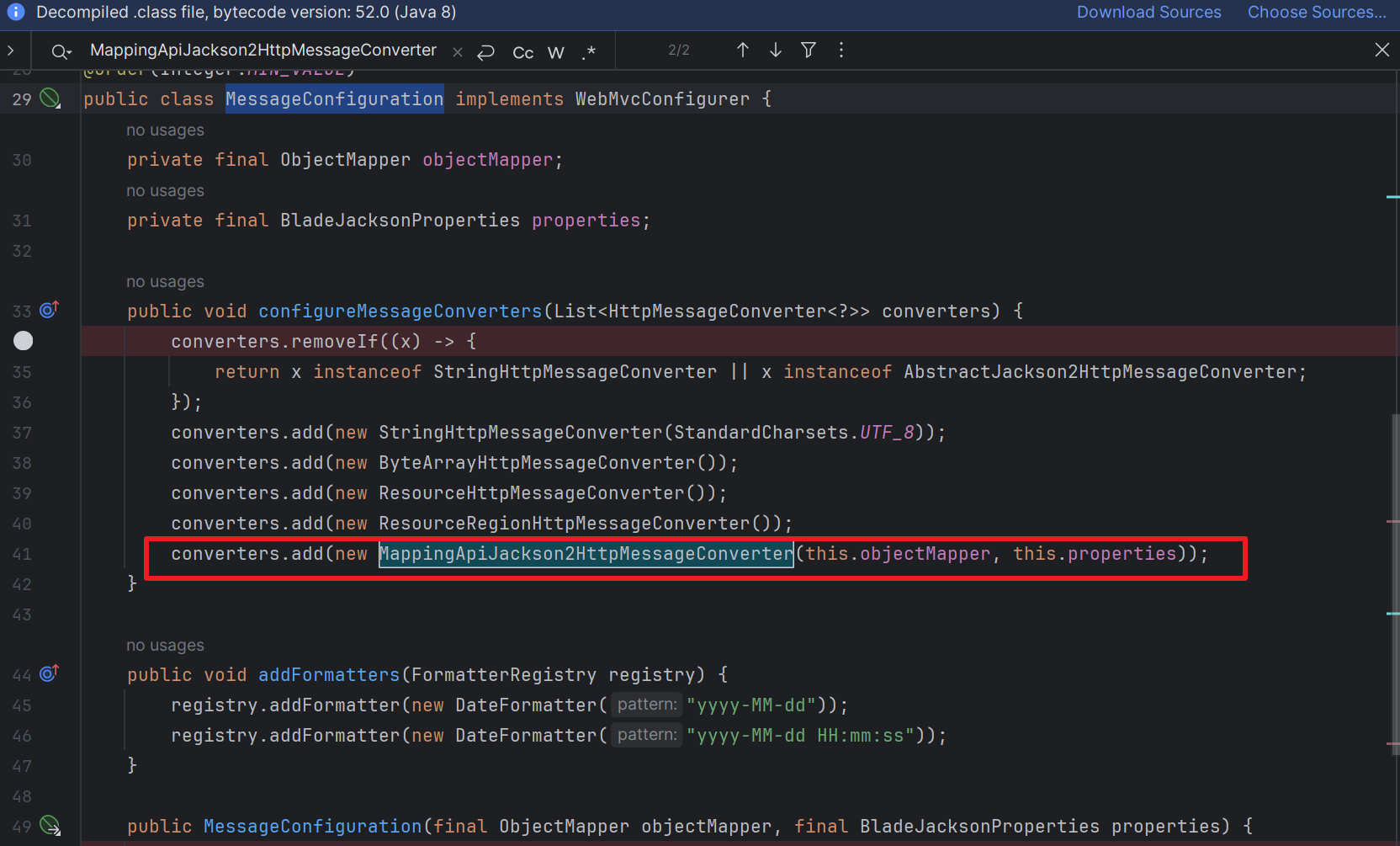 注意:Order 设置为 Integer.MIN_VALUE + 1,让我们写的这个类的 configureMessageConverters 方法,执行顺序在 原本MessageConfiguration类的configureMessageConverters方法之后,在我们的方法移出他们框架的MappingApiJackson2HttpMessageConverter,添加我们自己的 MappingApiJackson2HttpMessageConverter 类(后面代码有提供)。