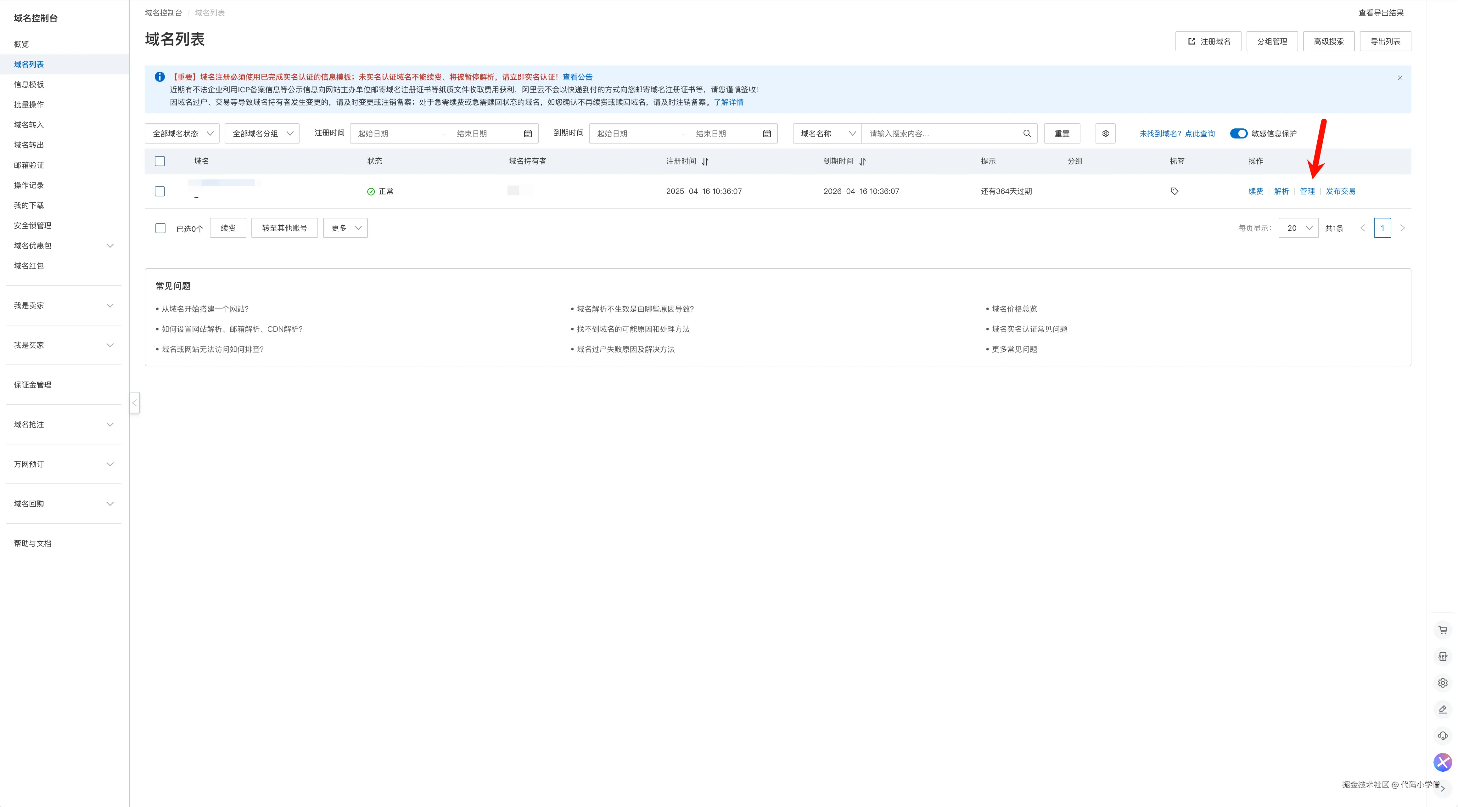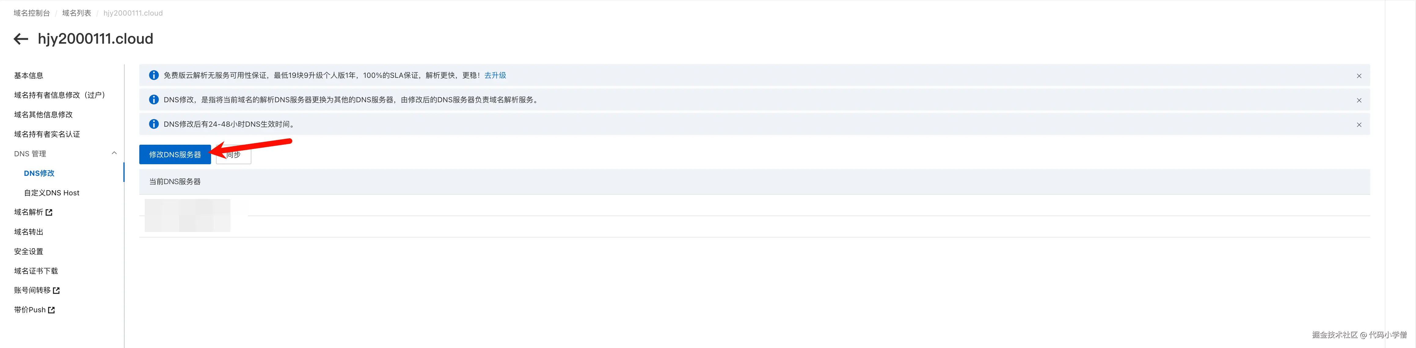 在阿里云域名列表点击管理域名,需要修改下 DNS 的配置