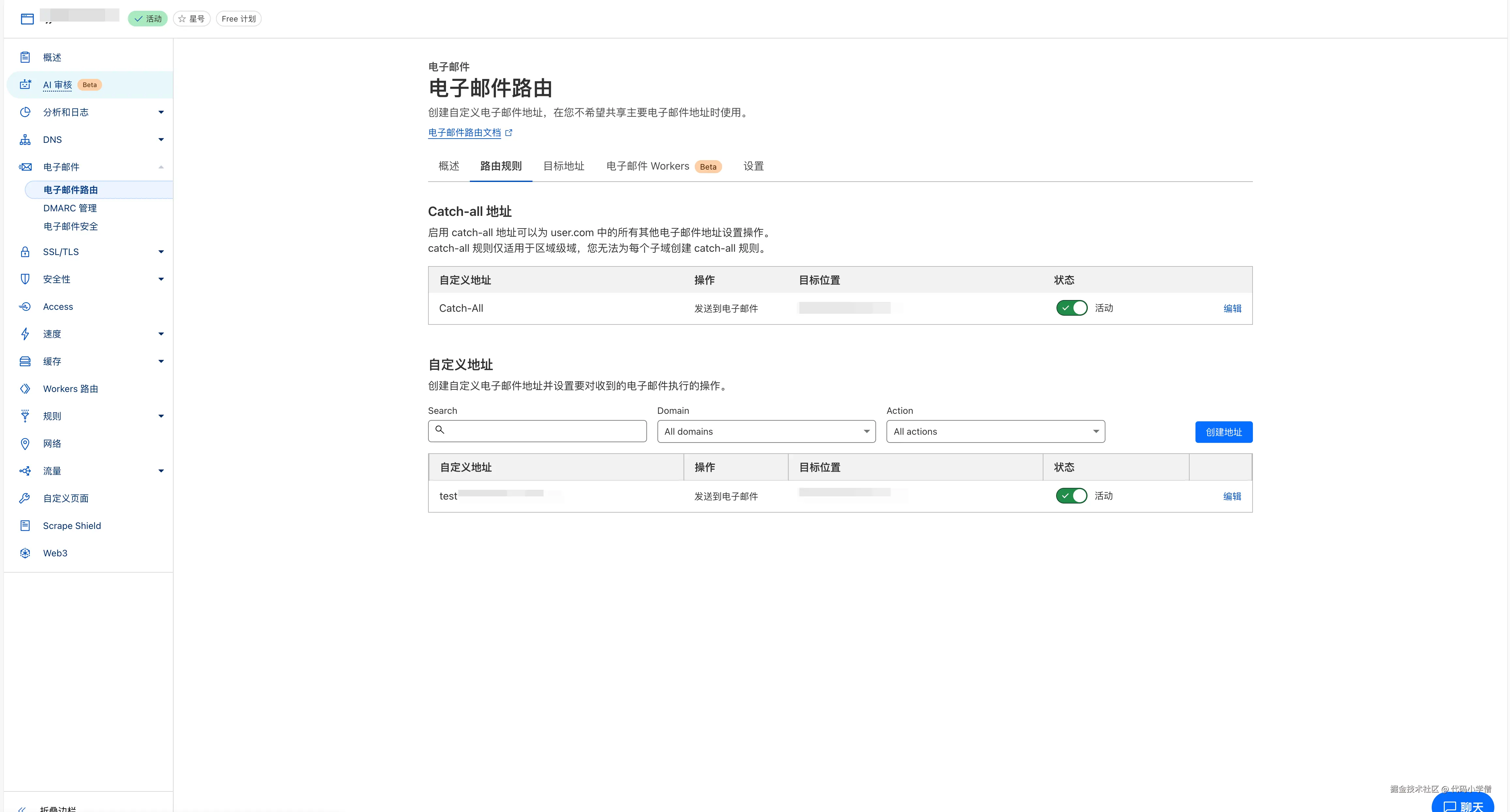 点击创建地址。例如你买到域名是 xxx123.com ,就可以注册 test@xxx123.com、test2@xxx123.com。然后再配置转发到真实的邮箱比如自己的 qq 邮箱或者 Gmail,来接收验证码之类的。