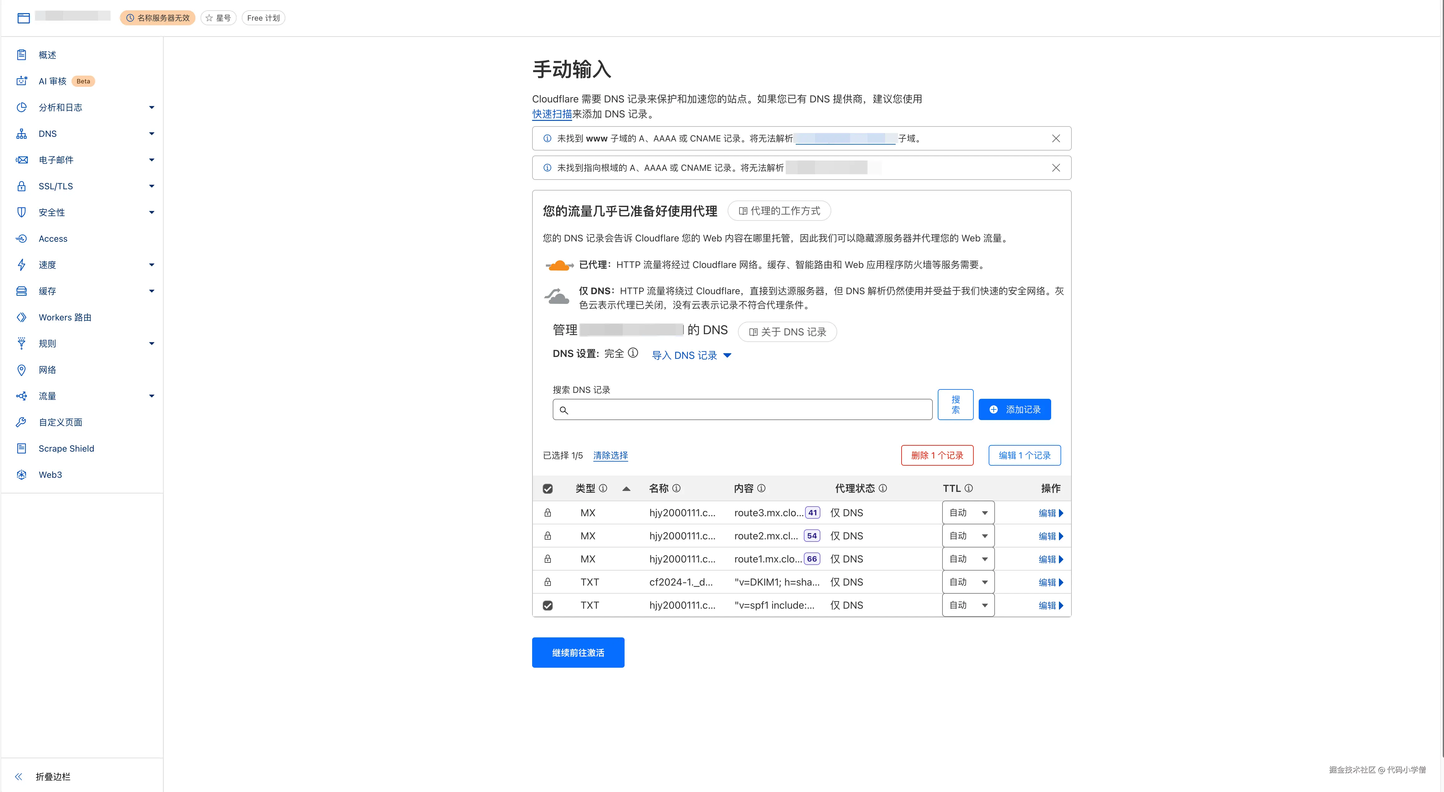 其实还需要有个修改域名 DNS 的操作,替换成 Cloudflare 提供的地址,由于我之前已经配置过了,所以没有此截图了。