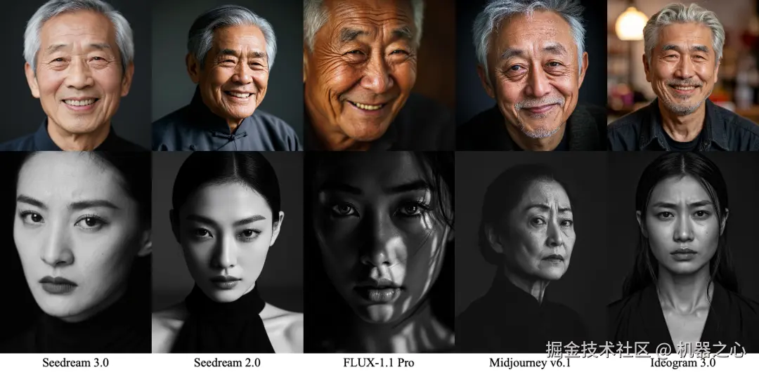 从示例可以看到,Seedream 3.0 能有效消除人像生成的「AI 感」,可生成带有皱纹、绒毛和疤痕等真实特征的皮肤质感,逼真度已基本接近专业摄影水平。