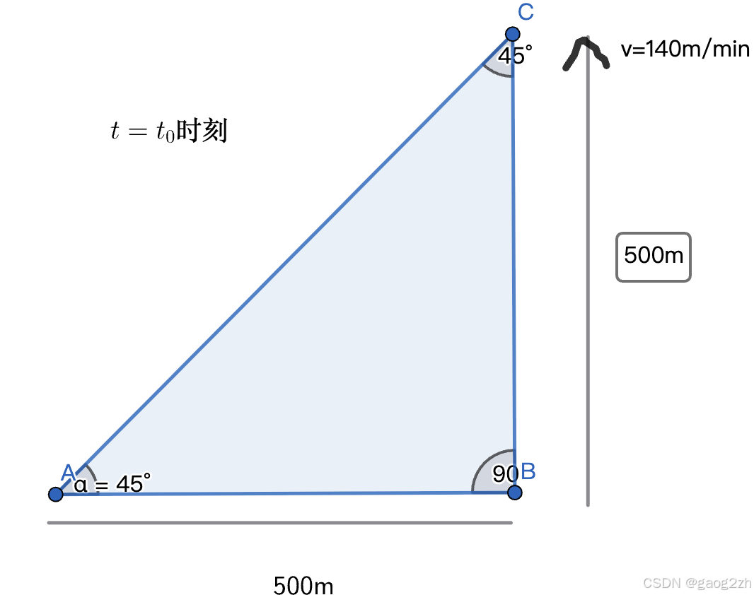 解: 观察员身高这里我们忽略不计 设气球上升上升 t ( m i n ) 后 , 其高度为 h ,观察员视线的仰角为 α , 则 tan α = h 500 其中 α 和 h 都与 t 存在可导的函数关系,上式两端对 t 求导,得 sec 2 α d α d t = 1 500 d h d t 由已知条件知,存在 t 0 时刻,使得 h ∣ t = t 0 = 500 m , d h d t ∣ t = t 0 = 140 m / m i n , tan α ∣ t = t 0 = 1 , sec 2 α = 2 , 带入上式得 2 ⋅ d α d t t = t 0 = 1 500 ⋅ 140 d α d t t = t 0 = 0.14 r a d / m i n 即此刻观察员视线仰角增加的速率为 0.14 r a d / m i n 解:\\ 观察员身高这里我们忽略不计\\ 设气球上升上升t(min)后,其高度为h,观察员视线的仰角为\alpha,则\\ \tan\alpha = \frac{h}{500}\\ 其中\alpha和h都与t存在可导的函数关系,上式两端对t求导,得\\ \sec^2\alpha\frac{d\alpha}{dt}=\frac{1}{500}\frac{dh}{dt}\\ 由已知条件知,存在t_0时刻,使得\\ h|{t=t_0}=500m,\frac{dh}{dt}|{t=t_0}=140m/min,\tan\alpha|{t=t_0}=1,\sec^2\alpha=2,带入上式得\\ 2\cdot\frac{d\alpha}{dt}{t=t_0}=\frac{1}{500}\cdot 140\\ \frac{d\alpha}{dt}_{t=t_0}=0.14rad/min\\ 即此刻观察员视线仰角增加的速率为0.14rad/min 解:观察员身高这里我们忽略不计设气球上升上升t(min)后,其高度为h,观察员视线的仰角为α,则tanα=500h其中α和h都与t存在可导的函数关系,上式两端对t求导,得sec2αdtdα=5001dtdh由已知条件知,存在t0时刻,使得h∣t=t0=500m,dtdh∣t=t0=140m/min,tanα∣t=t0=1,sec2α=2,带入上式得2⋅dtdαt=t0=5001⋅140dtdαt=t0=0.14rad/min即此刻观察员视线仰角增加的速率为0.14rad/min