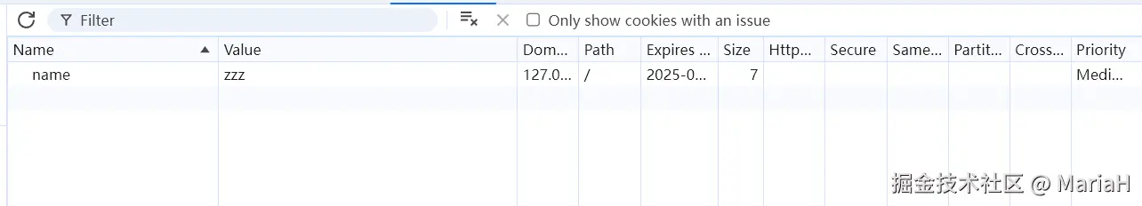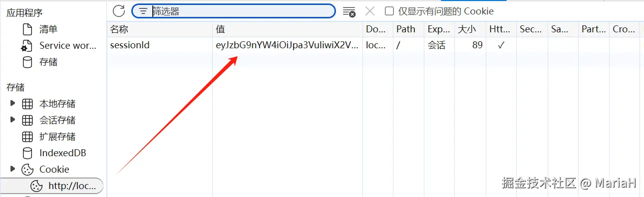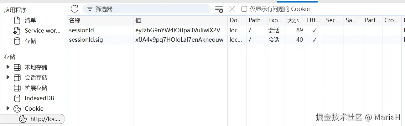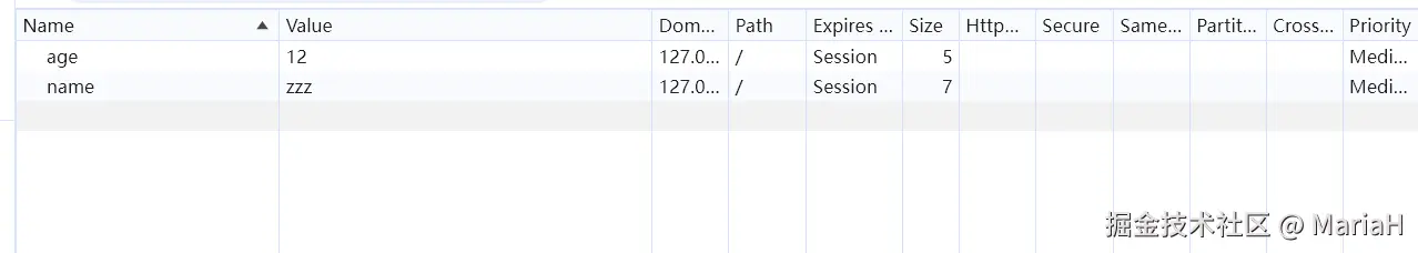 我们编写如上代码,然后在浏览器中打开开发者工具Application选项可以查看Cookie