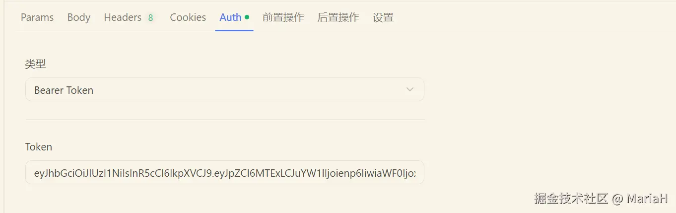 我们可以看到当我们进行了请求之后客户端获取了服务器颁发的token,然后我们在服务端模拟一下开发中接收到客户端携带Token的情况,客户端携带Token一般是服务端规定的,一般放在header中,我们使用apifox来模拟一下