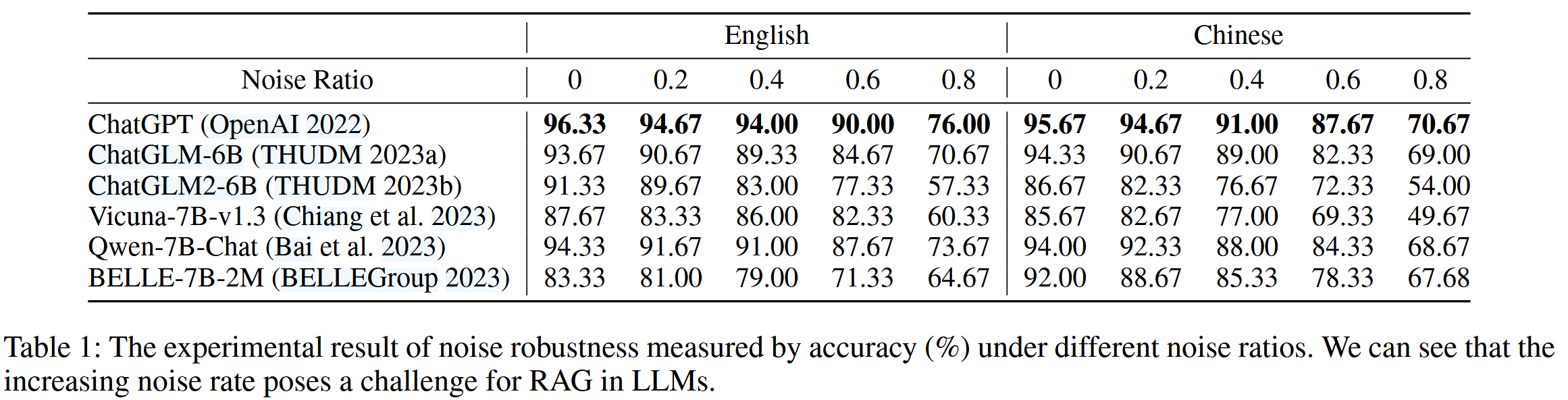 (2) 噪声率的增加对 LLM 中的 RAG 构成了挑战。 具体而言,当噪声率超过 80% 时,准确率在 0.05 的显著性水平下显著下降。 例如,ChatGPT 的性能从 96.33% 下降到 76.00%,而 ChatGLM2-6B 的性能从 91.33% 下降到 57.33%。