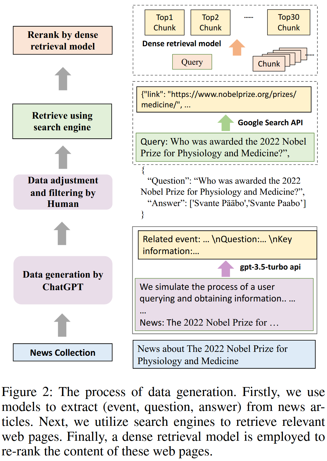 问答实例生成:收集最新的新闻文章,并使用提示让 ChatGPT 为每篇文章生成事件、问题和答案。图2所示,对于一篇关于"2022 年诺贝尔奖"的报道,ChatGPT 将生成相应的事件、问题并提供关键信息来回答问题。 通过生成事件,模型能够初步筛选出不包含任何事件的新闻文章。 生成后,我们手动检查答案并过滤掉难以通过搜索引擎检索的数据