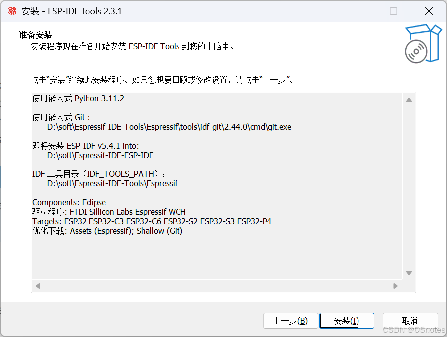 -> 选择要安装的 ESP-IDF 版本,目前最新为 v5.4.1 -> 选择 ESP-IDF 安装路径